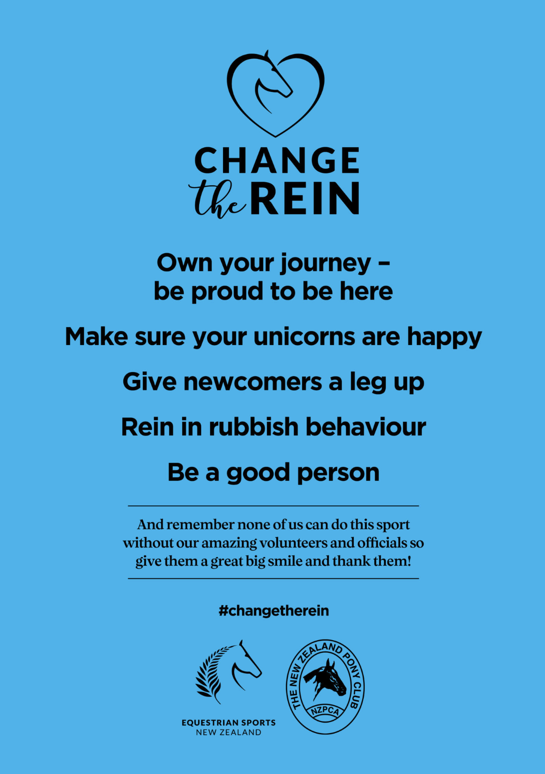 - Embrace the Change the Rein campaign, designed by NZPCA and ESNZ to advocate for a caring, supportive, and positive culture in the sport.